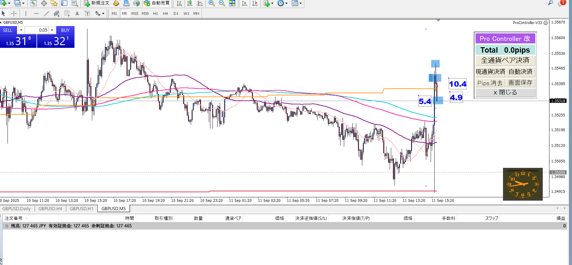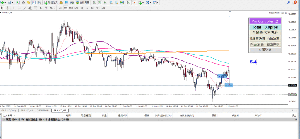 下の画像は指標でチャートが大きく振れたときに入りました。ポンドが下がると予想していましたので、いったん上げた時点で2本エントリーし、下がった時点ですぐに決済しました。