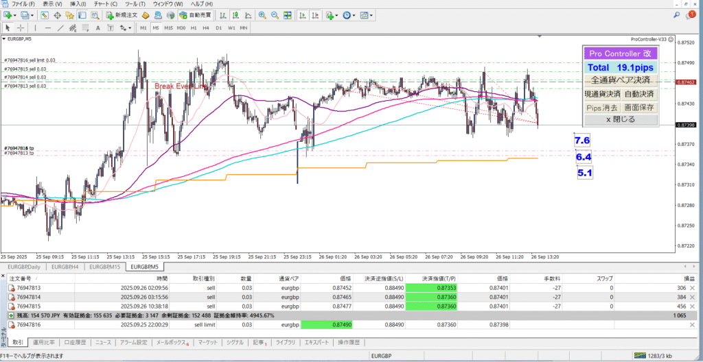 昨日寝る前に指値を置いていたものがかかっていました。4本のうち3本エントリーされており、起きたときにはほんのわずかに利益がでていましたが、すぐに赤字に反転しました。
