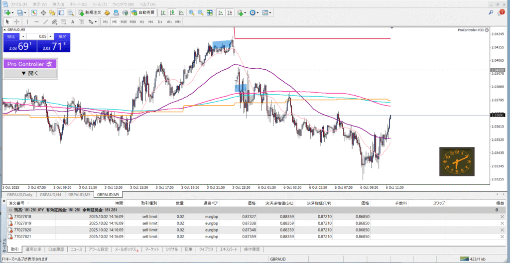 最近はポンドオージーを取引していなかったので、市場の流れについては把握していなかったのですが、日足・4時間足・他の移動平均線もきれいに下向きにそろっていたのでエントリーしました