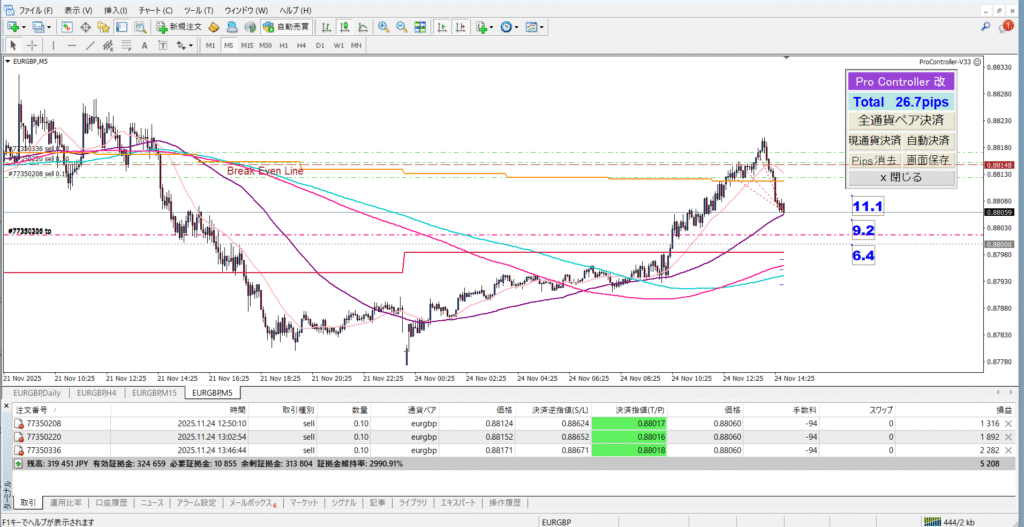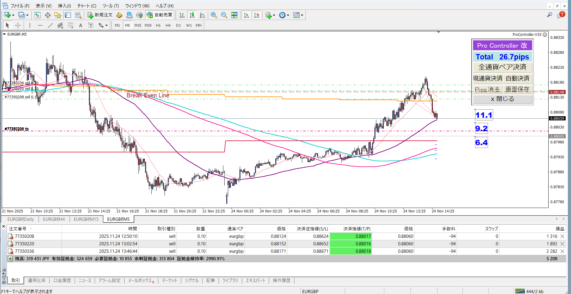 • 設定した利確には届きませんでしたが、75SMAで動きが止まったため決済しました。