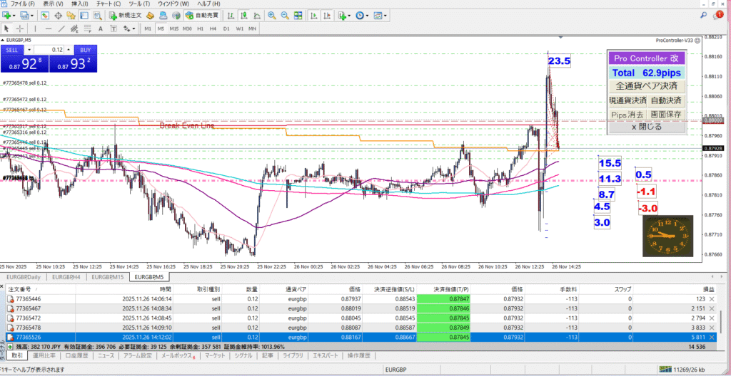 レンジの中で大きく上下に動いていて、上がればエントリー、下がれば決済というスキャルピングを無数に繰り返していました。
