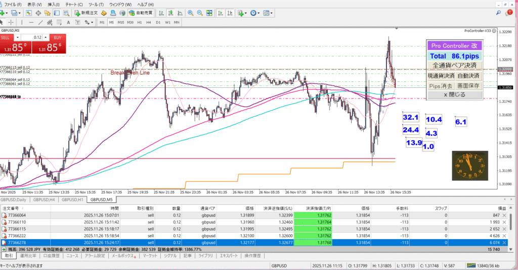 ユーロポンドを監視していましたが、ひととおりチャートに落ち着きが戻ると、ポンドドルも激しく動いており、こちらも上がったらエントリー、下がったら決済、と何度か繰り返しました。