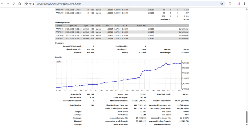 2025年11月のFX収支は+169,101円、口座残高は425,897円になりました。